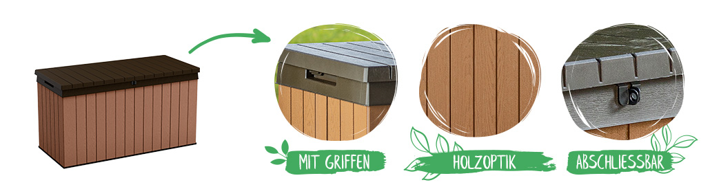 Mit einem großzügigen Fassungsvermögen von 570 Litern, bietet die Box genügend Stauraum für allerhand Gartengeräte, Sitzauflagen oder Kinderspielzeug. Der Inhalt bleibt stets trocken und gut geschützt. Der Deckel ist mit einem Vorhängeschloss abschließbar und lässt sich durch zwei Gasdruckfedern mühelos öffnen